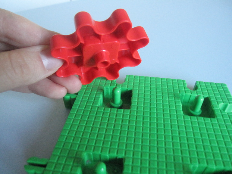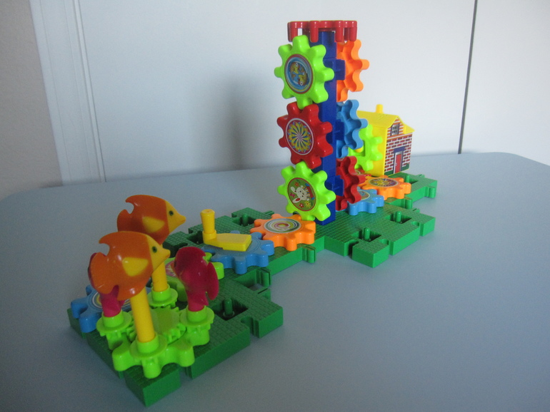 Начали мы собирать такой конструктор в 2 года 9 месяцев. Первоначально у дочки возникали небольшие трудности с надеванием шестеренки на ось. Ведь дырочка маленькая и прикрыта сверху.