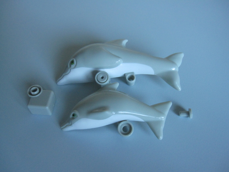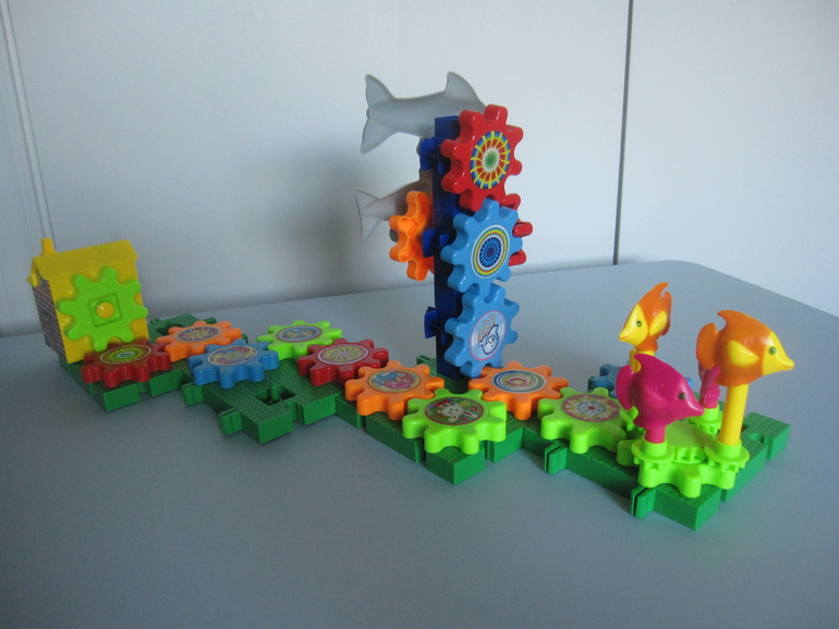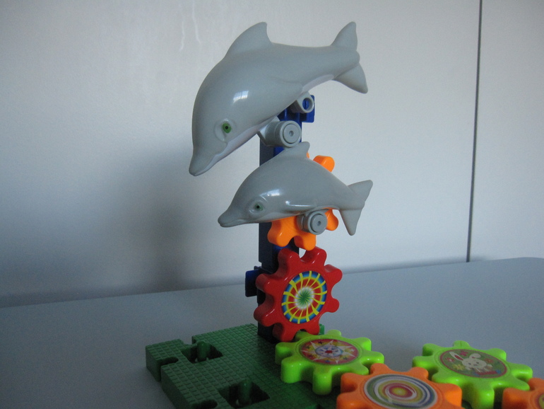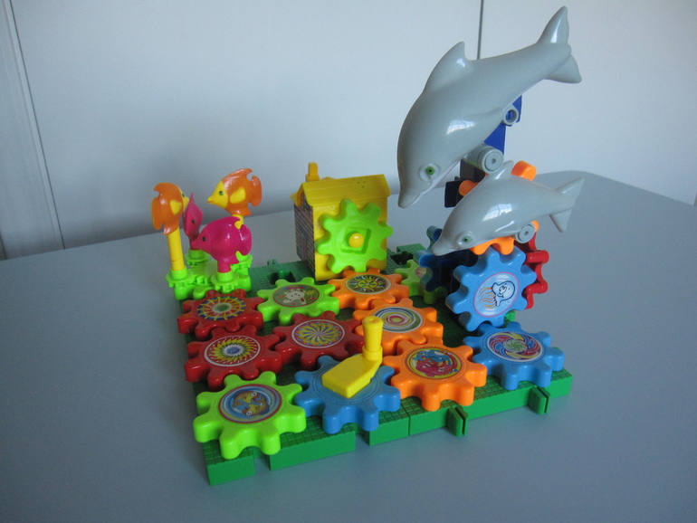 Но очень быстро процесс наладился, и она стала собирать без моего участия. Приходилось только корректировать некоторые моменты. Например, когда рыбки установлены слишком близко к дельфину, и они мешают друг другу двигаться. Приблизительно с 3 лет собирает полностью все самостоятельно.