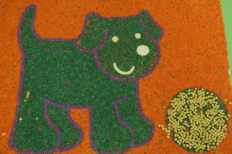 Часть 1. Рисование песком. Одним из пунктов программы был мастер-класс по рисованию цветным песком и пластилином. Пластилином мы уже пробовали рисовать дома, поэтому занялись цветным песком. Множество коробочек, в каждой свой цвет. Преподаватель предложила нам на выбор любую картинку, выбрали собачку. На этом моменте у Лёни выкатились слезы, стало страшно. К нам ведь подошла тетя, мало ли что. Преподаватель тут же поняла, отошла и всё - Лёня расслабился. Людей рядом он уже не замечал, он творил.