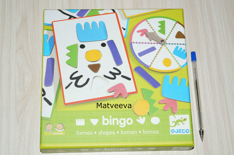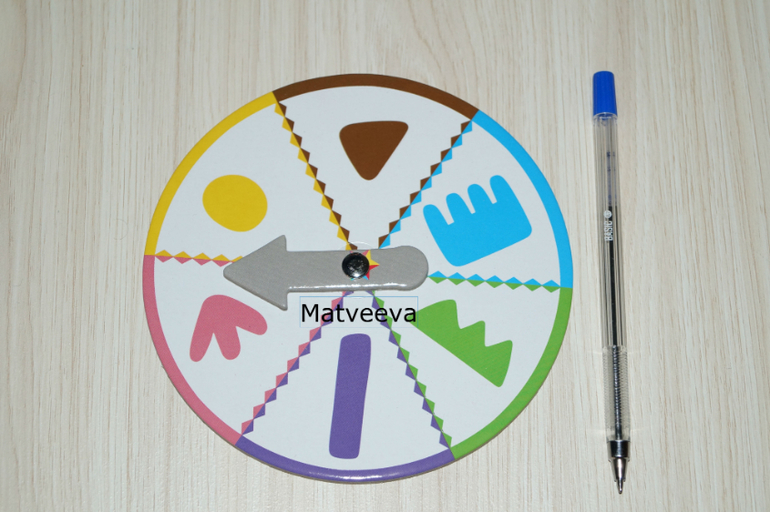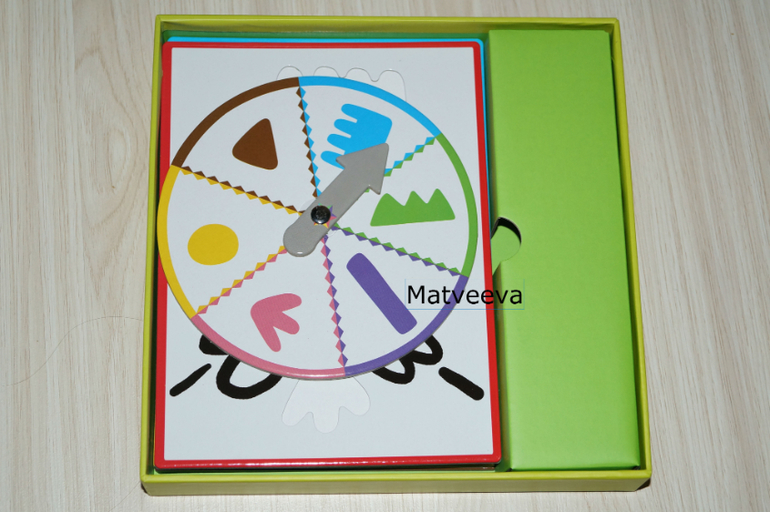 Правила: игроки выбирают себе карточку, затем по очереди раскручивают стрелку и вставляют ту фигурку, которая выпала. Если место фигурки уже занято, то все остается по-прежнему и ход переходит к следующему игроку) выигрывает тот, кто первый заполнит свою карточку)