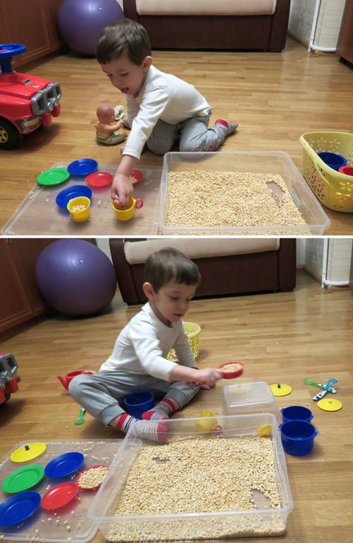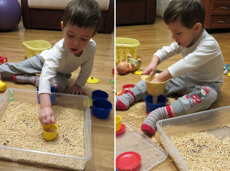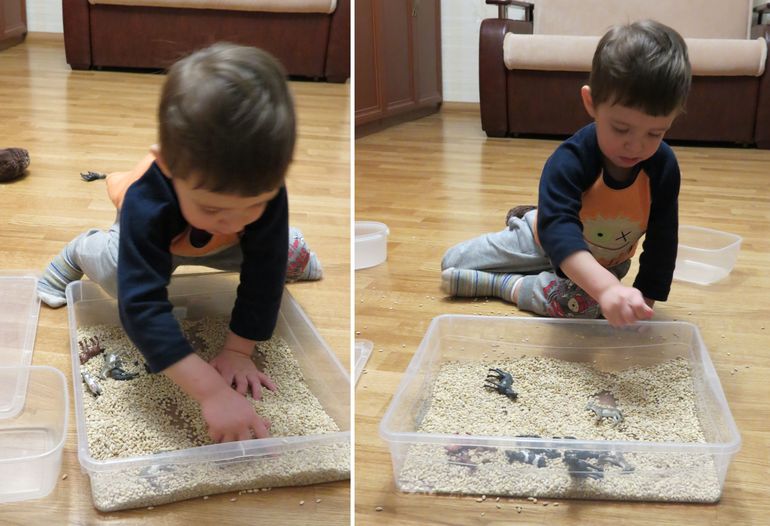 Все-таки тематическую сенсорную коробочку нужно сделать. Хотя бы для того, чтобы понять, сможет ли она завлечь Лёню дольше, чем просто килограмм крупы, и увидеть, какая судьба ее ждет. (Лёне 2 года и 2 месяца)