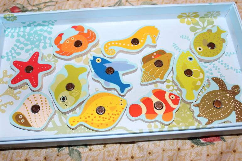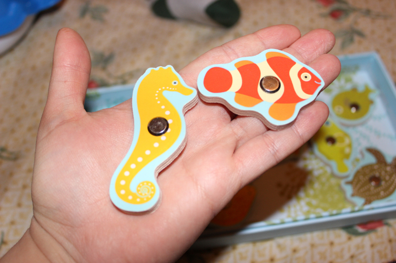 Качество игрушки как всегда на высоте. У Djeco по-другому не бывает. Одна только гладкая голубая коробочка вызывает у меня эстетическое удовольствие. Все морские обитатели (12 шт), сделаны из дерева и в центре каждого из них установлена маленькая железная пластина, собственно, для примагничевания. Также в комплекте 2 удочки, на крючках которых спрятаны магниты. Немного фото для наглядности.