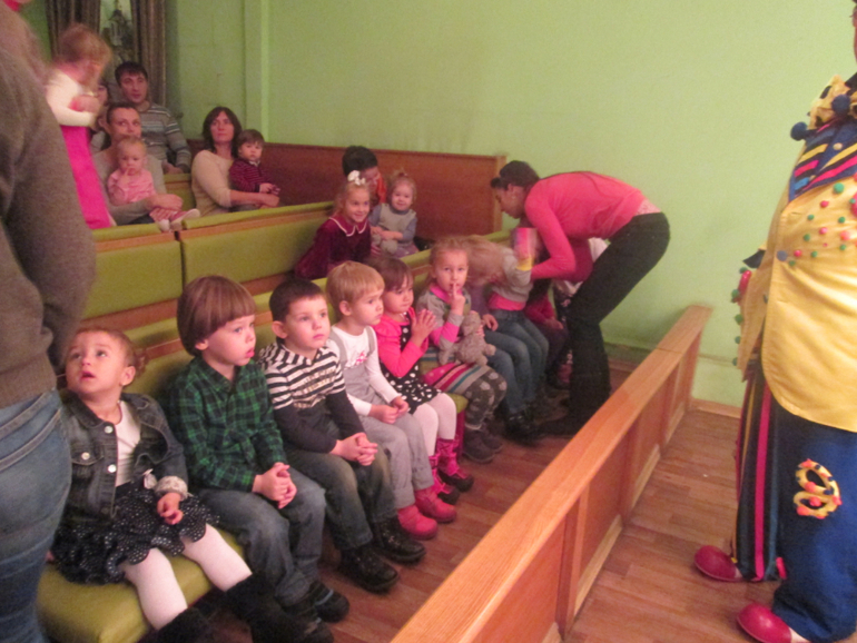 Приехали минут за 5 до начала. Спокойно прошли к дверям, всех впустили, детей сказали посадить на 2 первых ряда и тут зачем-то родители начали устраивать панику "садись! быстрее! я ухожу! мы будем сидеть отдельно!".. дети разволновались, Сережа спросил "Мамочка, ты что от меня уходишь?", хотя всегда спокойно относится, если идет без меня. Началась какая-то толкотня, скорее занимать места, какие-то все нервные... Хорошо, что быстро началось представление и дети перестали обращать внимание на психующих родителей