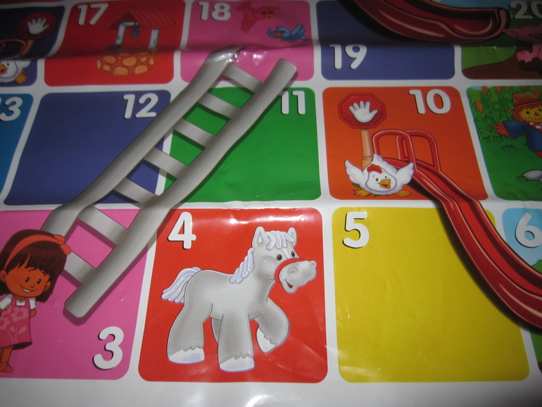 Поднимаются в игре по лестницам, спускаются по горкам. Всего на поле 5 лестниц и 4 горки. Как по мне последнюю горку надо делать поближе к финишу, чтобы сохранять интригу до конца игры.
