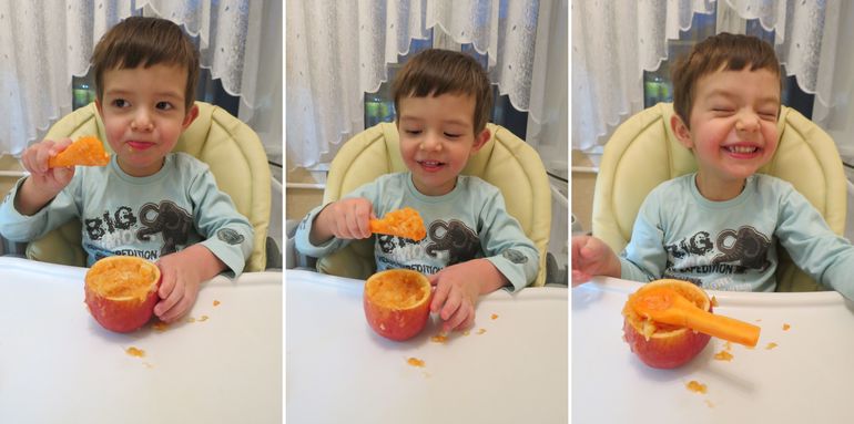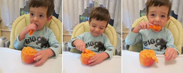 Для справки: морковные ложки выдержали всю трапезу и дождались с работы папу, который их с нашего разрешения СЪЕЛ. Ложки можно больше не покупать! (Лёне 2 года и 2 месяца)