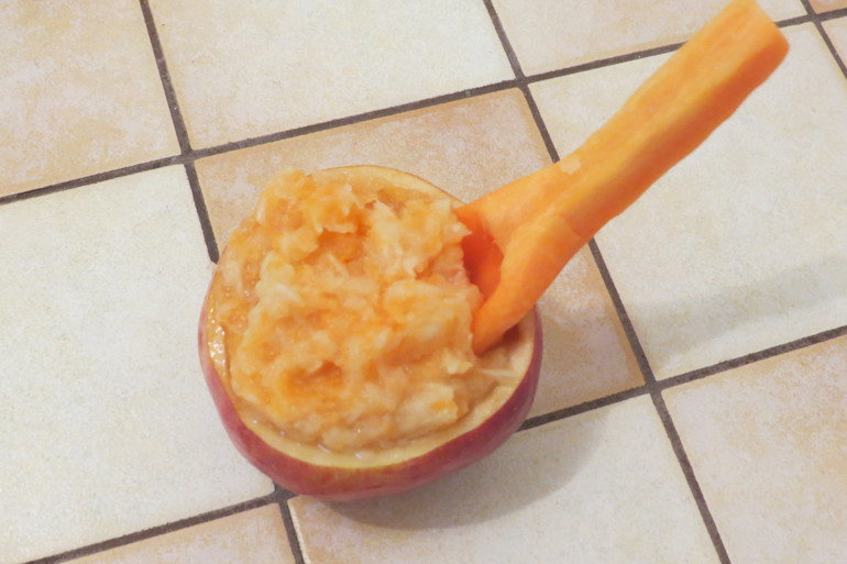 На всякий пожарный (в случае поедания одной ложки) вырезала из второй морковки запасную. Лёня встретил полдник с удивлением.