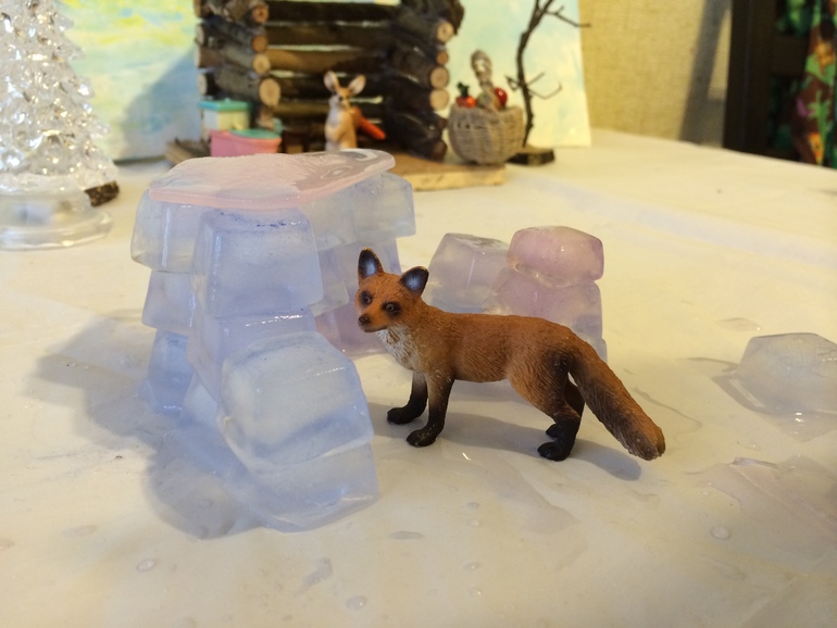 Все герои сказки в своих домиках. Архитектура домика лисички менялась несколько раз. Очень даже интересно строить из ледяных кирпичиков. И пока весна не пришла (лед не начал таять ) можно и строить и обживаться
