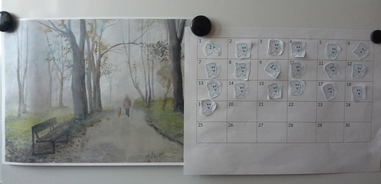 Текущий месяц будет у нас обозначаться тематической картинкой. Эта - ноябрь. Ноябрьский парк. Дедушка гуляет с собачкой вдоль аллеи сбросивших листья деревьев. Будем учиться составлять рассказ по картинкам заодно