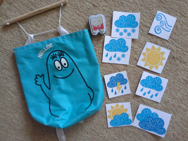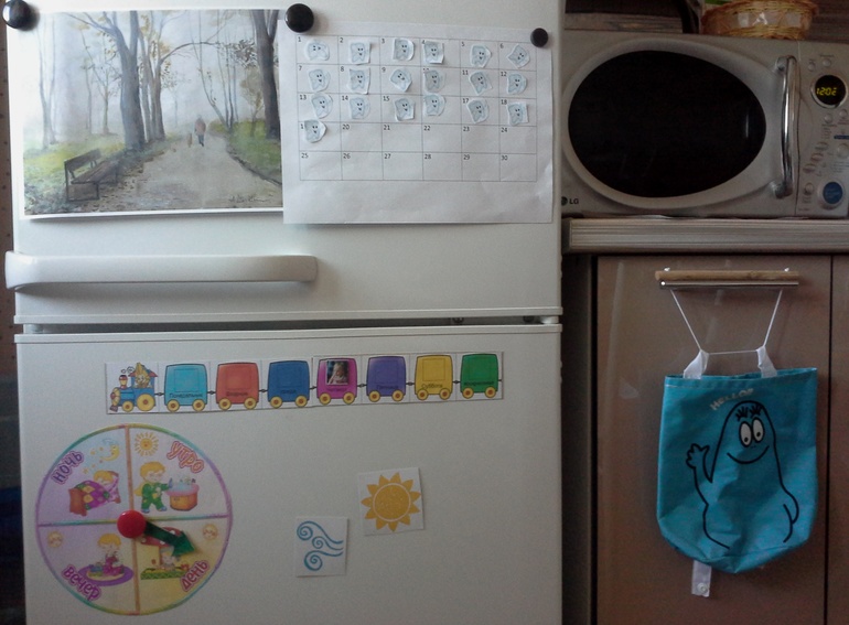 Картинки для "погоды" и коробочка с "зубными" наклейками хранится у нас в кармашке, который висит рядом с холодильником (на заглавном фото видно)