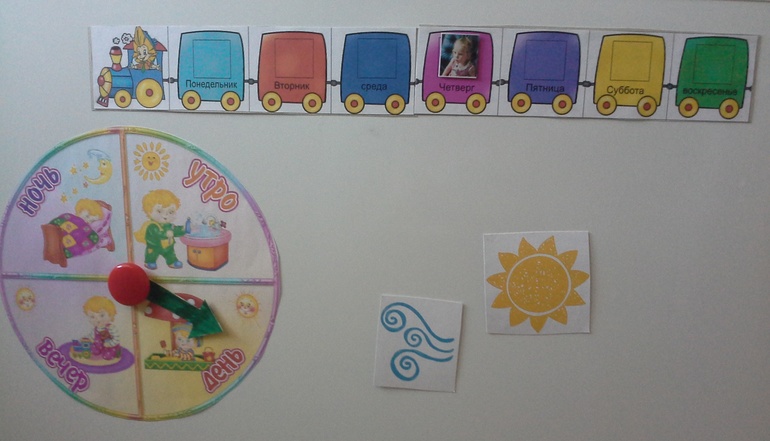 Дни недели у нас представлены поездом с 7 вагончиками. Магнитная фигурка Ульянки будет каждый день перемещаться в следующий вагон.