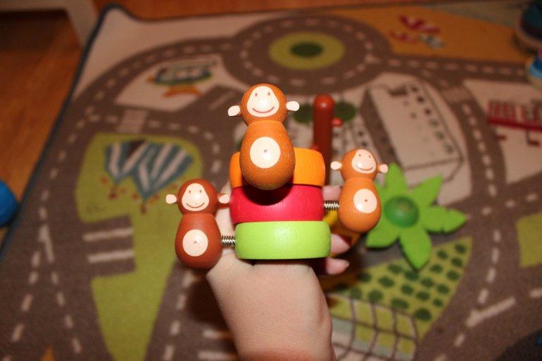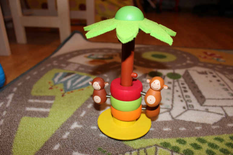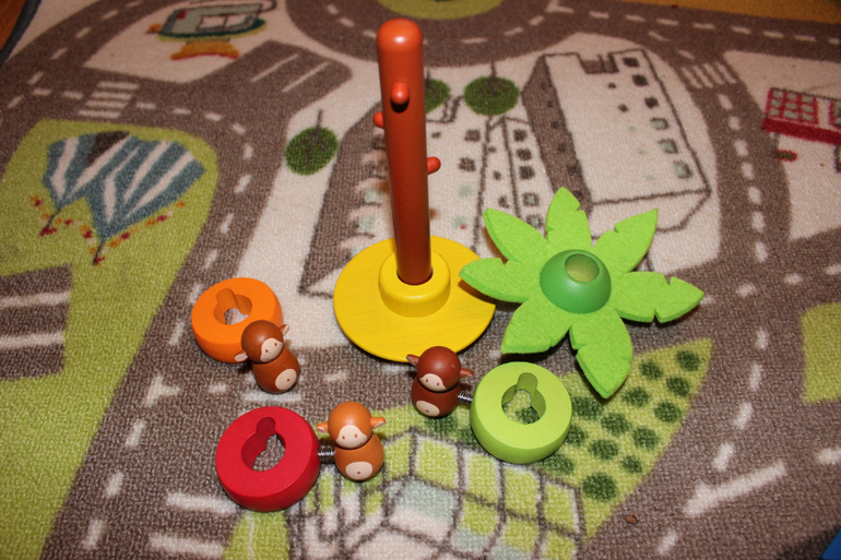 Все части пирамидки, кроме листьев, из дерева. Костик пока ее не освоил, получается довести до конца максимум одну обезьянку, потом сын сдается) поэтому собирает вместе со мной.