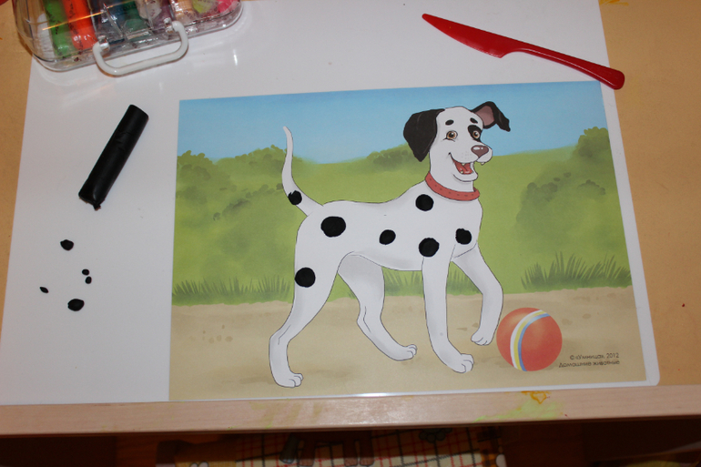 И превращали собаку-альбиноса в далматинца. Правда тут мы использовали не краски, а тесто для лепки.