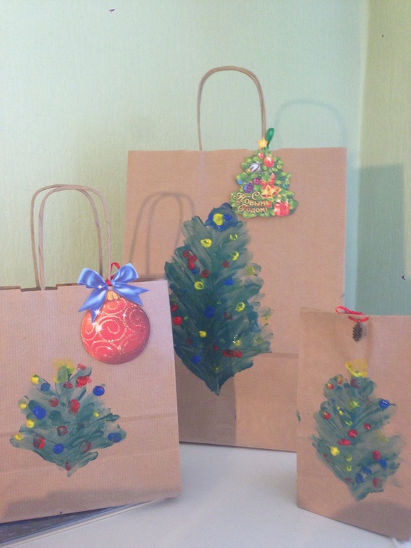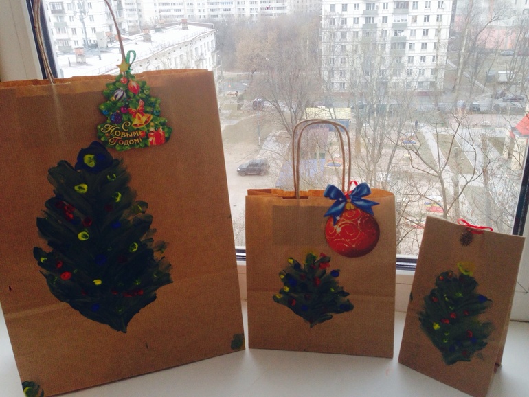В первый день зимы руки так и зудели сделать что-то новогоднее.Тем более совсем недавно я затарилась праздничной упаковкой для группы в детском саду,не позабыв при этом и о себе любимой- решила к Нг сразу закупиться.Набрала у одной мастерицы с livemaster крафт-пакетов разных размеров,ярлычков,ленточек.Ну а с дочей мы их небного доработали с помощью пальчиковых красок.Получилось бюджетно и симпотишшшно)