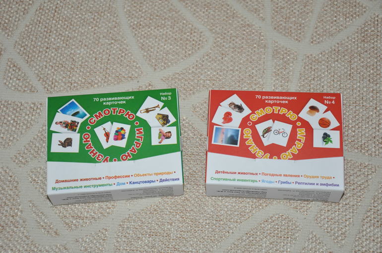 В серии вышли 4 комплекта карточек на русском языке и 2 на английском. Мы пока активно пользуемся русскоязычными карточками. Коробки у нас сохранились только от двух последних комплектов, вышедших в этом году, выглядят они вот так: