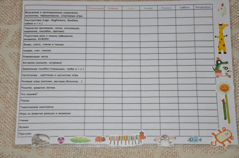 Такая таблица очень помогает нам организовать свой день и неделю, не забывать про разные виды игр, которые у нас есть, а маме (особенно, работающей)) чувствовать, что день для ребенка прошел не впустую))