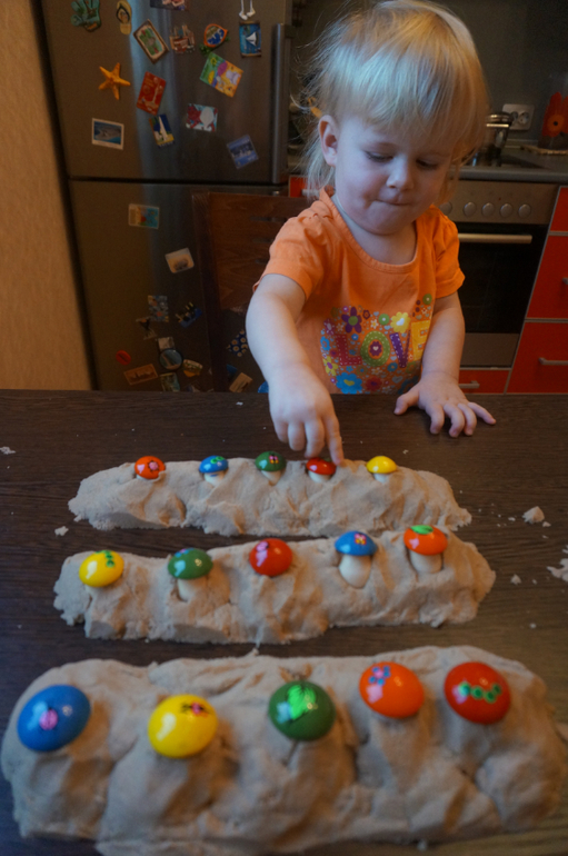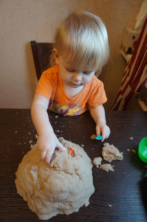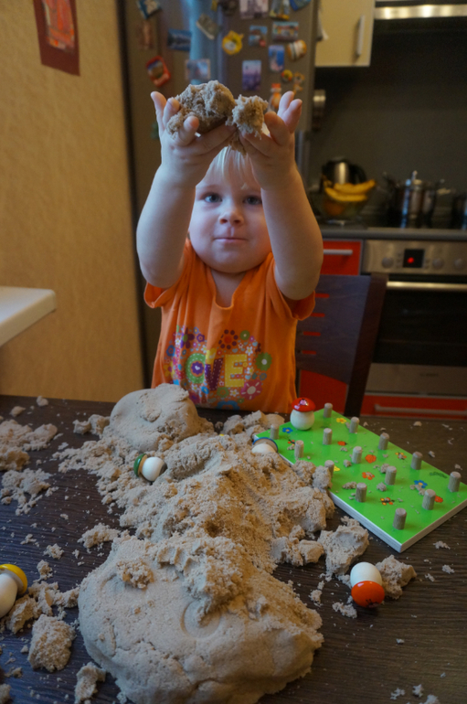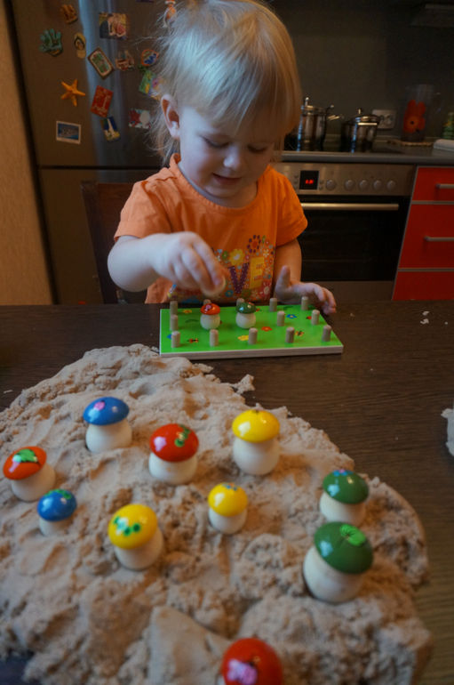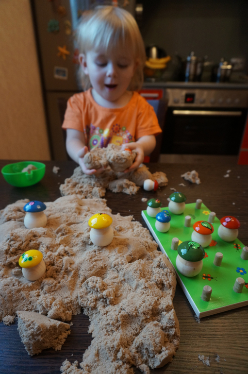 Мы с Машей понасажали грибы в грядки из кинетического песка, потом прятали и находили, кормили мишек, повторяли цвета. ребенок в восторге!Будем фантазировать дальше!