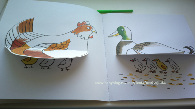Этот разворот очень меня тронул- такие милые и заботливые мамочки -курочка и уточка.Тигран как увидел деток, то сказал: "Мама, я тоже хочу к тебе под крылышко!"