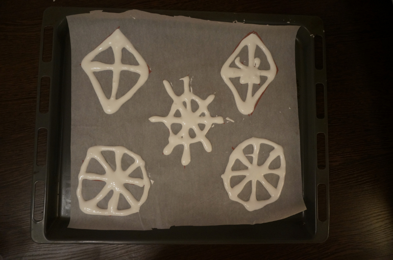 Игры и игрушки от 0 до 99 (Про игры и игрушки которые подойдут и большим и маленьким)Я потихоньку приучаю Машу к приготовлению пищи. На днях мы пробовали печь снежинки- безе. Рецепт простейший - 1 белок, щепотка соли и 50г. сахара взбиваются миксером до густоты и блеска. На пергаменте рисуются маркером снежинки, переворачиваешь бумагу и выдавливаешь тесто из шприца или пакета. Сушишь где-то час на температуре 100 градусов. Маша мне помогала ляпать немного, а моя версия получилась толстовата, но все равно милая! Можно повесить на ёлочку! Осторожно снимайте, трескаются очень быстро!