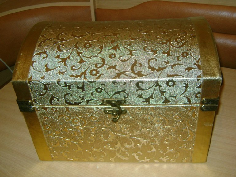 В этом году-большой золотой сундук,очень прочный с металлическими вставками