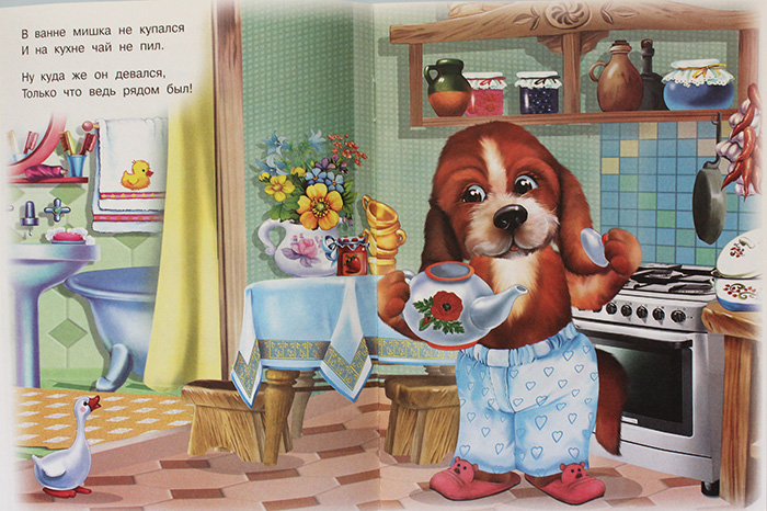 В книге 2 истории, первая про то, как щенок потерял своего медвежонка с которым всегда засыпал и отправился на его поиск.