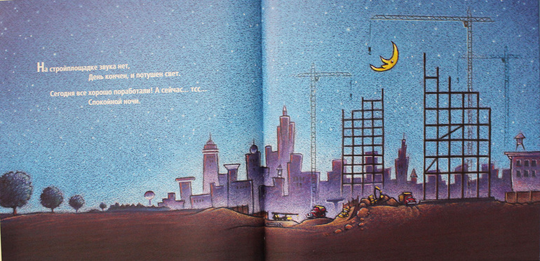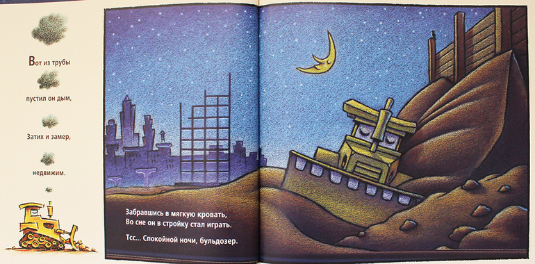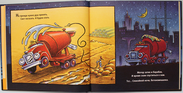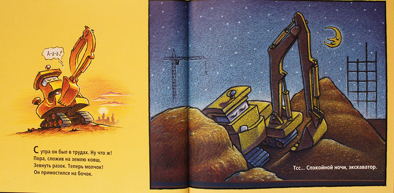 История о том, как стоительные машины завершают свою работу (работая на стройке) и укладываются спать. По моему мнению, задумка просто великолепная, но вот текст страдает (по моему мнению), но моего ребенка нисколько это несмущает. Еще раз повторю очень ее любит! Вот несколько разворотов.