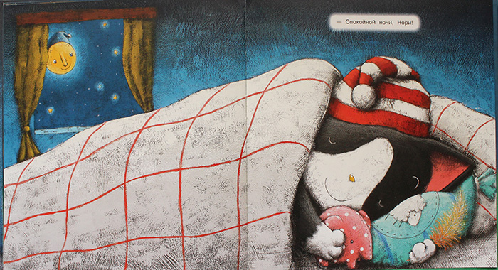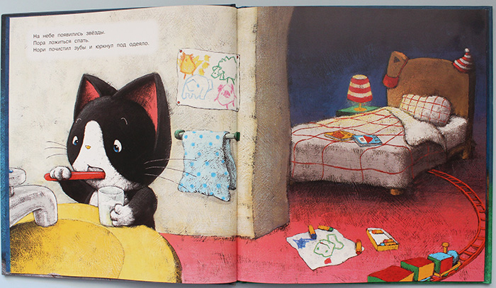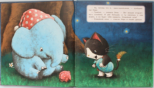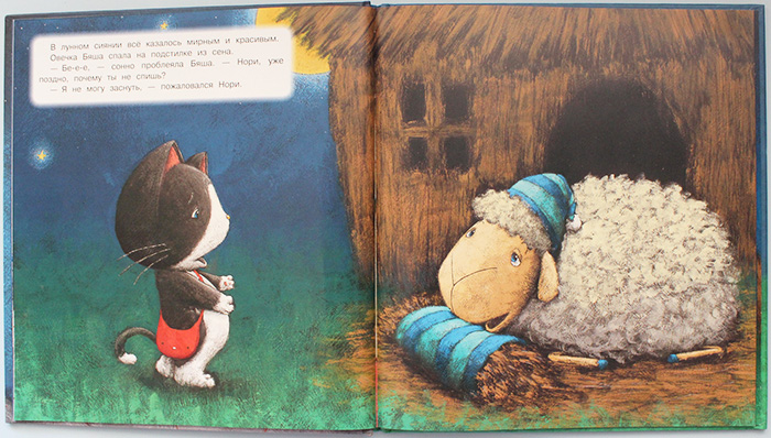 Книга о том, как маленький котенок по имени Нори, никак не мог уснуть и решил посмотреть, что делают его друзья: овечка Бяша, курочка Клуша, слониха Элла, попросенок Чух.
