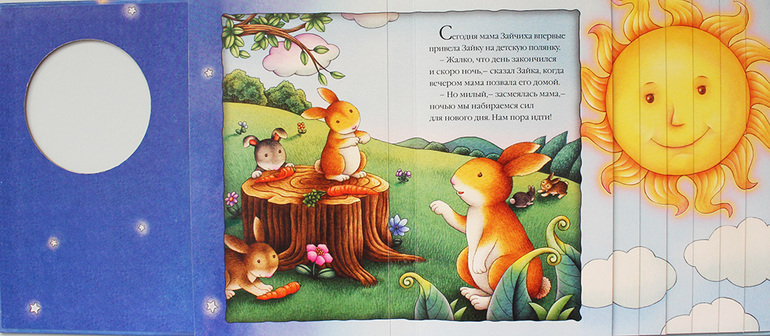 Задумка книги очень интересная, наглядно показывает ребенку, что когда мы просыпаемся светит солнышко (первая страничка книги), но когда приходит время готовится ко сну на небе появляется луна (последняя страничка книги)