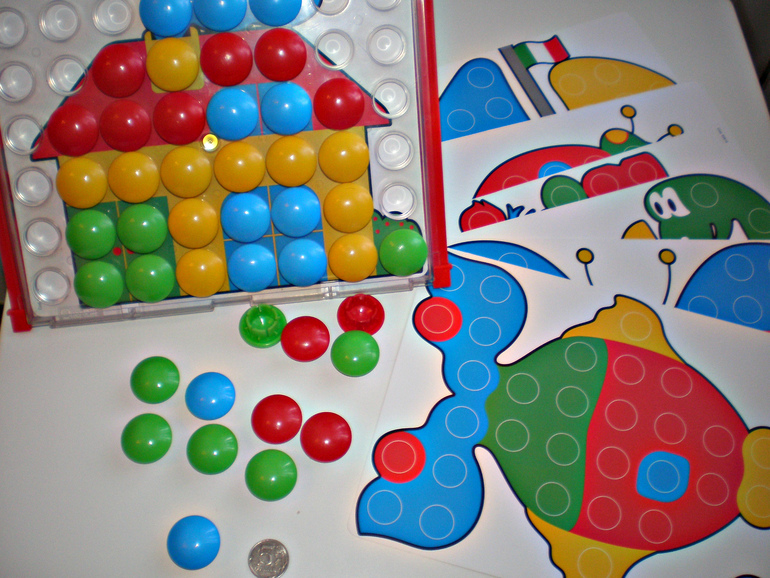 Мы тоже стали обладателями мазаики. Сыну очень понравилась, сразу стал из фишечек картинки собирать, правда собирать сильно сказано, все желтые расставит, а остальных па пару штучек для приличия и картинку меняет, сново все желтые и новую картинку.
