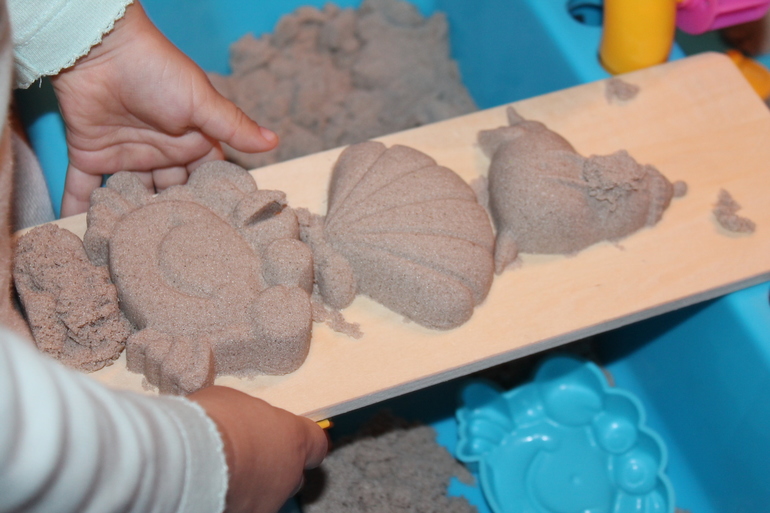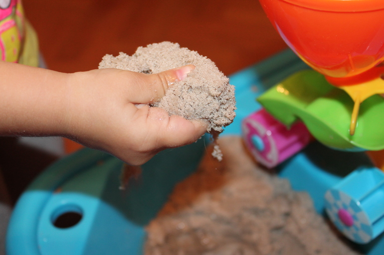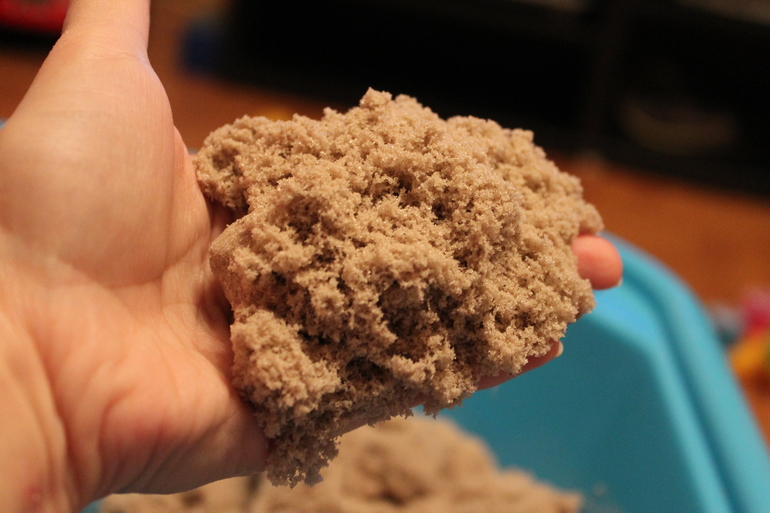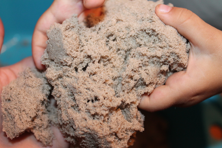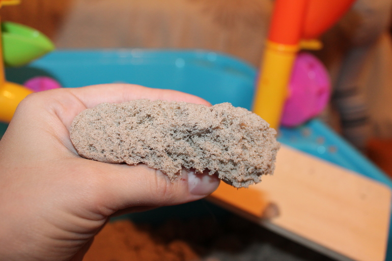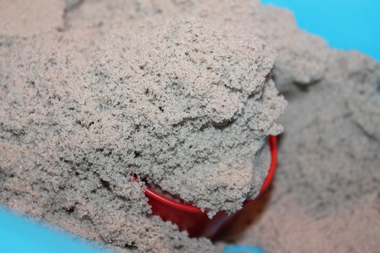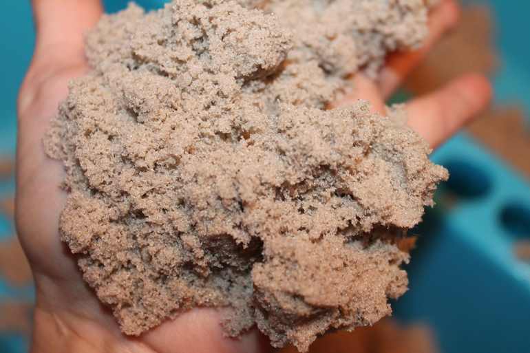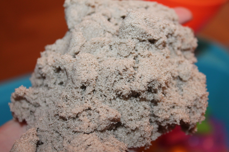 Кинетический песок к рукам не липнет, на песчинки не распадается, его легко собрать с пола, не имеет запаха.