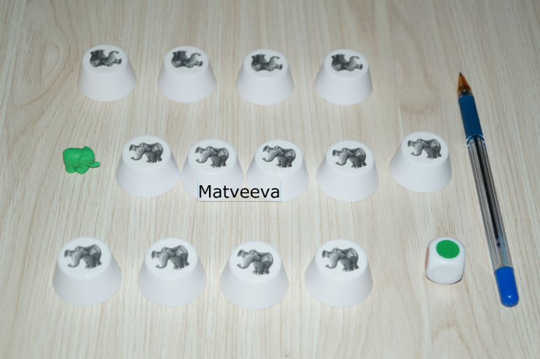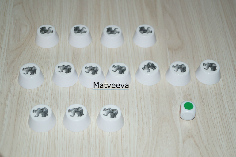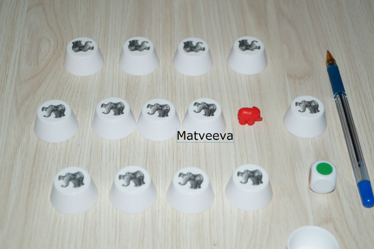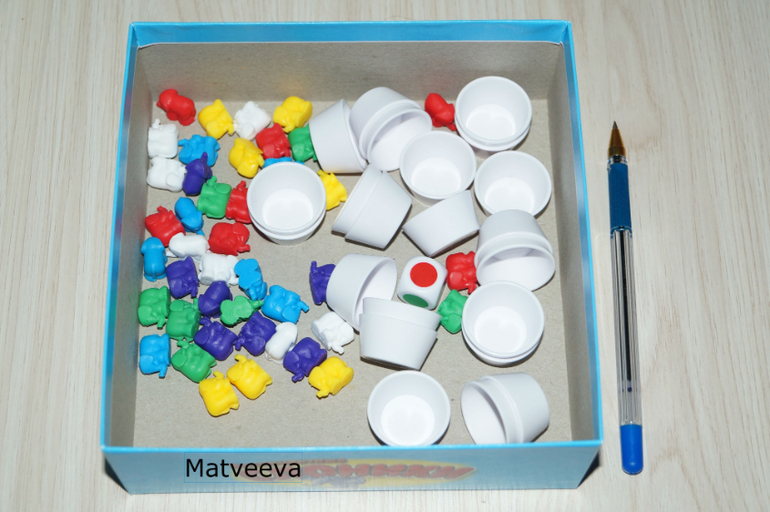Игроки по очереди, начиная с самого младшего, кидают кубик. Цвет, который выпал на кубике соответствует цвету слоника, которого надо найти) Игрок поднимает колпачок так, чтобы все видели, какой там прячется слоник)