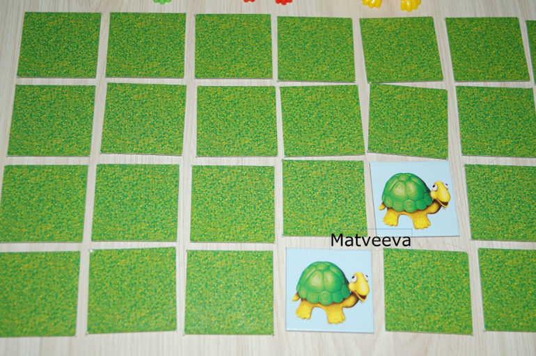 игру начинает самый младший игрок) переворачивает карточку и, если у одной из трех черепашек есть такое сочетание цветов, то он забирает эту карточку себе)) а если нет, то кладет карточку на место и меняет панцири и 2 или 3 черепашек местами)