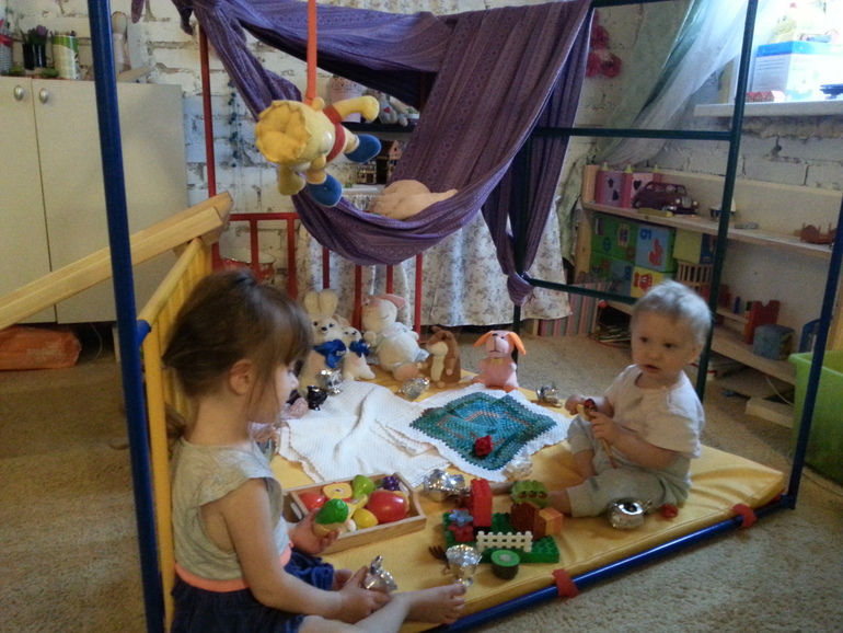 После 1,5 мес активных игр мы комплекс перевернули ! в положение манеж )) Дашиной радости не было предела. Так как получился очень уютный домик !