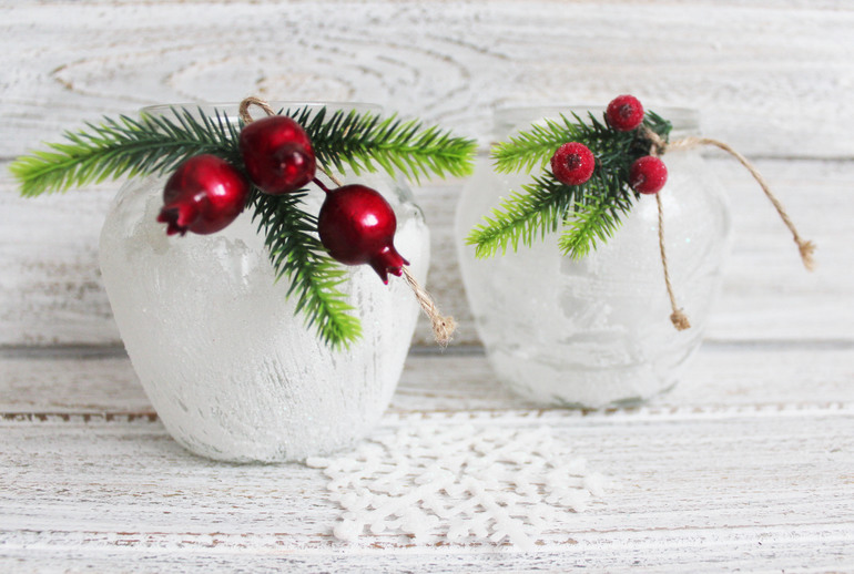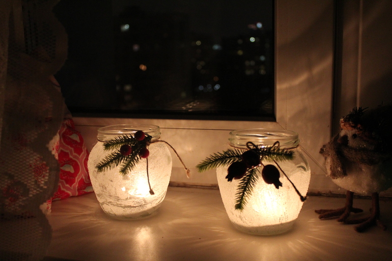 Сделать тоже довольно легко. Банки мы покрыли клеем ПВА, а затем посыпали мелким-мелким белым песочком, можно использовать искусственный снег, сахар, соль...