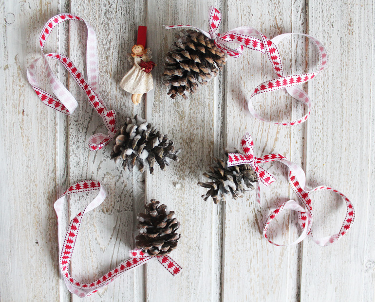 Шишки мы обваляли в снегу из баллончика, а потом старательно на шишки дули, чтобы снежок равномерно распределился по шишке, но этот снежок через какое-то время как бы тает, оставлял слегка заметный след.
