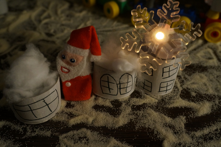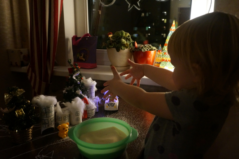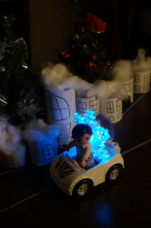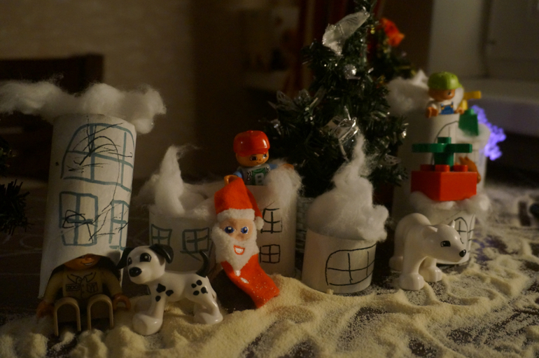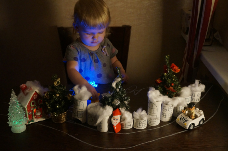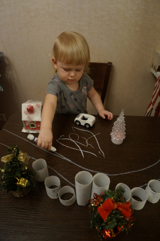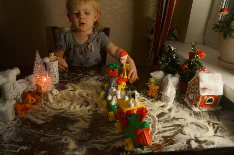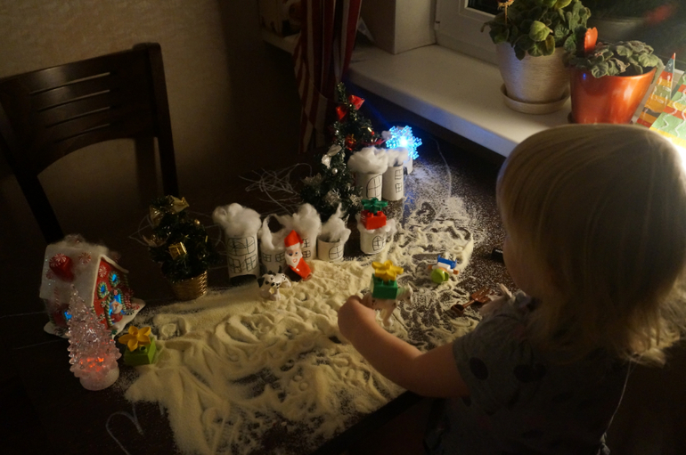 Игры и игрушки от 0 до 99 (Про игры и игрушки которые подойдут и большим и маленьким)Тема Рождества, праздника, волшебства увлекла нас с Машей очень сильно! По тв идет реклама о растворимом ролике от туалетной бумаги, а я их бережно коплю, чтобы потом сделать домики, улицу, городок....Населить его друзьями Лего, поставить домик Деда Мороза, расставить елочки, завезти на машине подарки, а потом дружно всех катать на поезде и купаться в снегу из манки! Играли больше часа, еще столько же убирались, но получилось таинственно и кайфово!