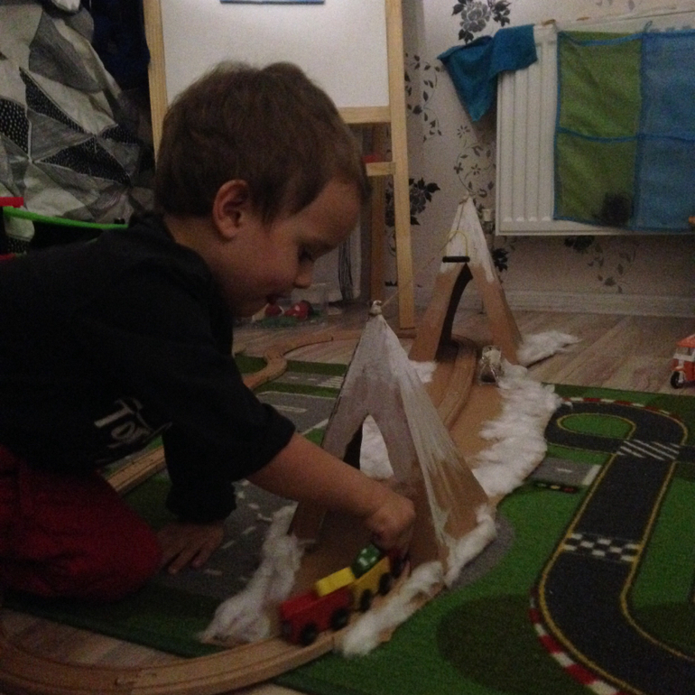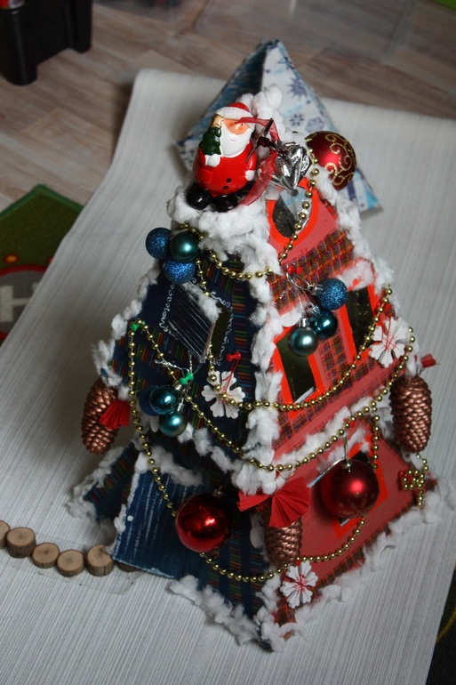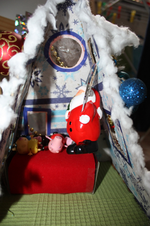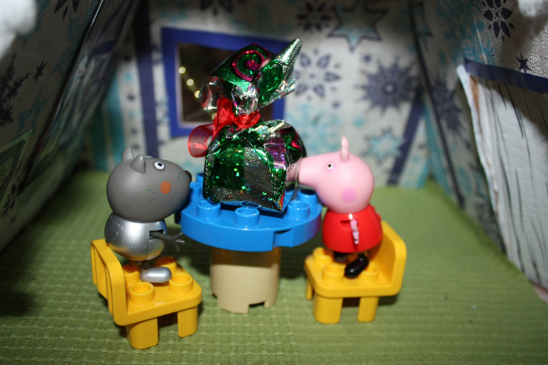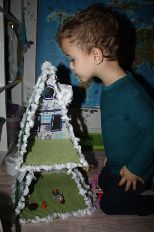 Первое, что мы сделали, это картонный Дом-Ёлку благодаря конкурсу в ИГ, который организовала чудесная мама-выдумщица Наташа. Выкройка для Дома-Ёлки есть у нее тут. Сын активно участвовал, чертил окошки под линейку, по его выкройке я и оставила кривенькое, вырезал выкройки, клеил обои из салфеток, внешние стены обклеивал скотчем декоративным, красил, швы обклеивал ватой, ну и конешно шары вешал. А потом для игры была сделана мебель из картона-тв и диван. И заселенные друзья Свинки Пеппы стали встречать Новый год, и даже получили подарки от ДМ.