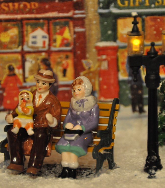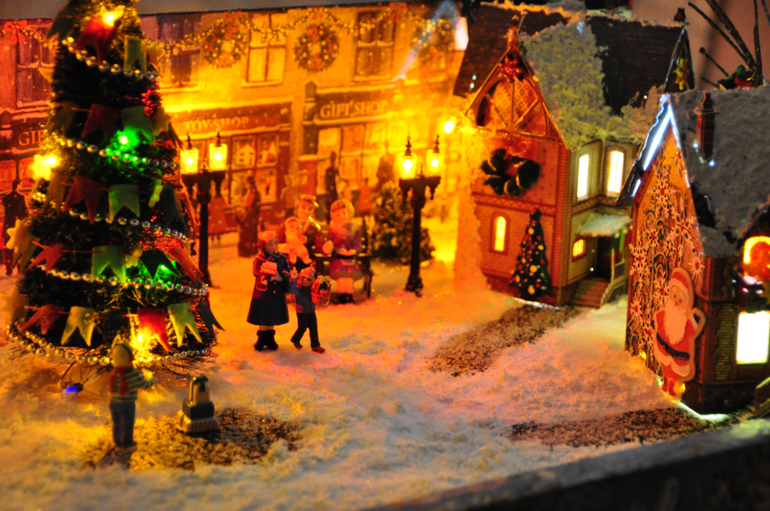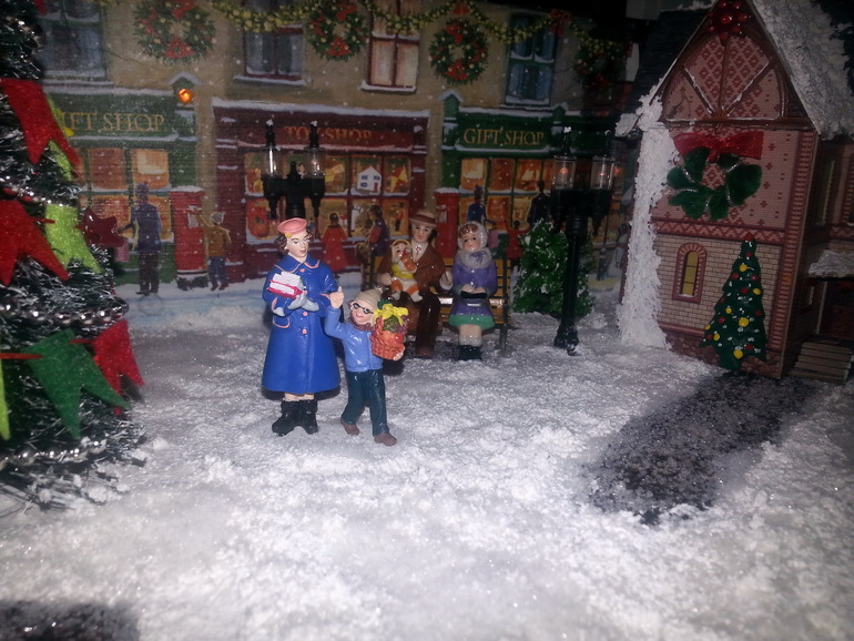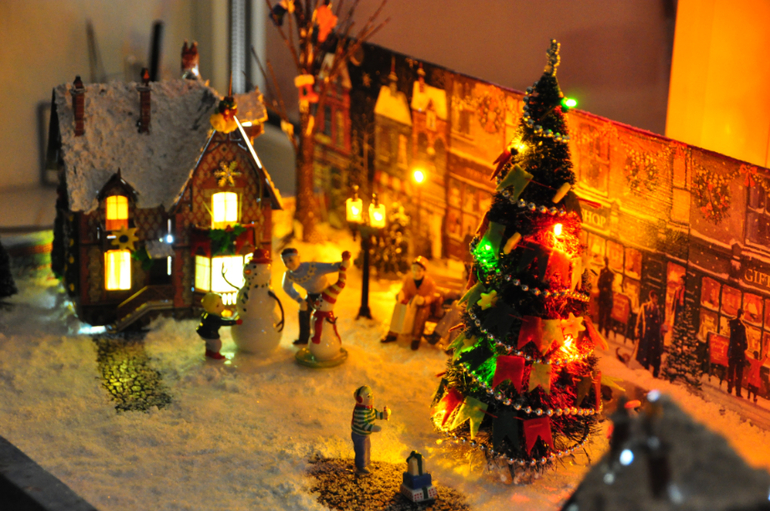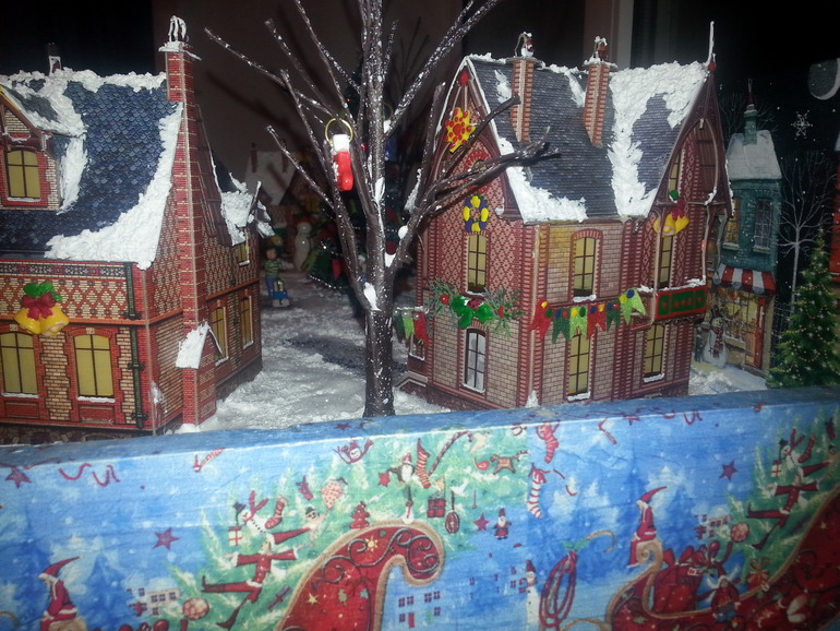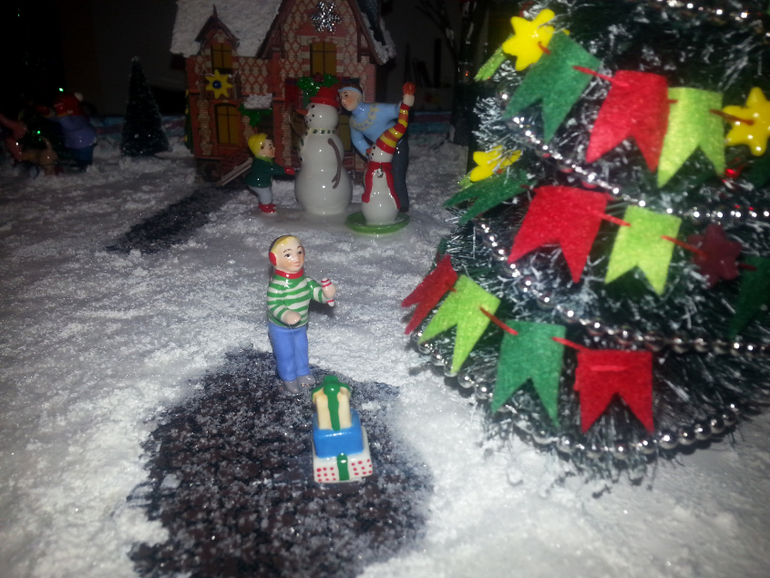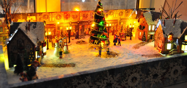 Ну и конечно без декора дело не обошлось. На крышах домов с помощью структурной пасты появился снег, стены домов украсила самодельными елочками, веночками и прочей новогодней атрибутикой, ну а акриловые краски добавили цвет и фактуру. Но мне этого мало! Я хотела реалистичной картины, поэтому заказала амазоне фонари (по большому счету это моя блажь, можно обойтись светодиодными свечками), замечательный набор елочек, деревьев, снега и дорожек, ну и конечно фигурки людей. Кстати елочки можно сделать из обыкновенных ершиков для бутылок, вот здесь отличный мастер-класс. Потом наступил черед сборки. Проводкой занимался муж, я в этом деле ни бум-бум. Благодаря его стараниям появилась подсветка у домиков, фонарей, гирлянде на центральной елке и в заднике тоже стоит несколько светодиодов. Домики, фигурки, деревья приклеивались на пистолет, мне так спокойней, у Катюшки ни будет соблазна чего-нибудь стащить. Ну и финишная прямая-снег. У меня он был в наборе, но его без проблем можно купить здесь. Пришлось повозиться. Мне не хотелось, чтобы при малейшем ветерке хлопья снега поднимались в воздух, да и для Катюшки будет лишний повод подурачиться, поэтому я все делала на века. Смешивала клей ПВА с белой грунтовкой, аккуратно разливала по поверхности пенопласта, а потом поверху сыпала снег, немного, совсем чуть-чуть. После этого кисточкой все перемешивала, создавая снежный покров. Дорожки тоже слегка припорошила. Сначала их щедро сбрызнула обычным лаком для волос и быстренько (пока лак не высох) посыпала снежком.