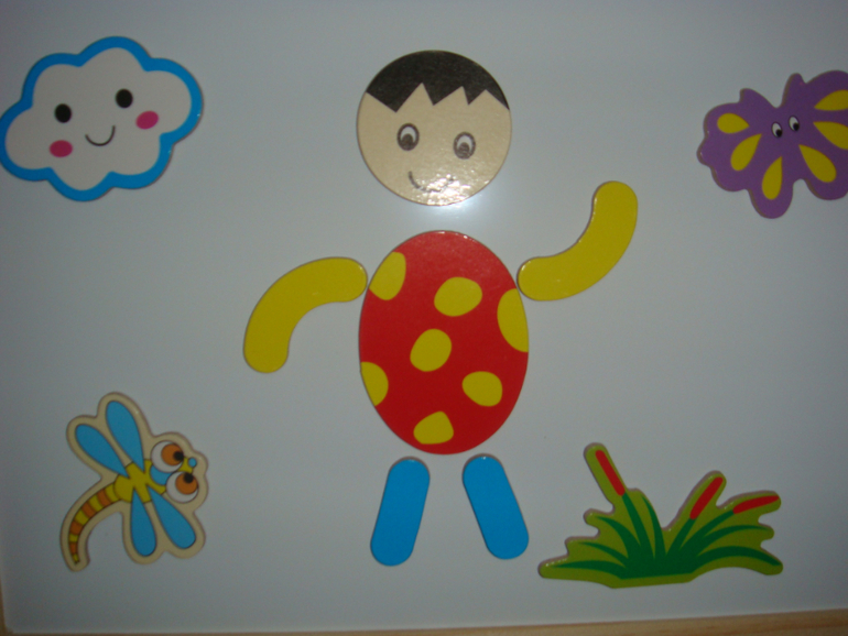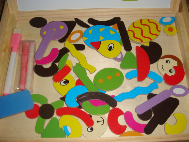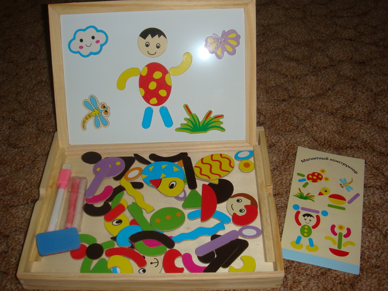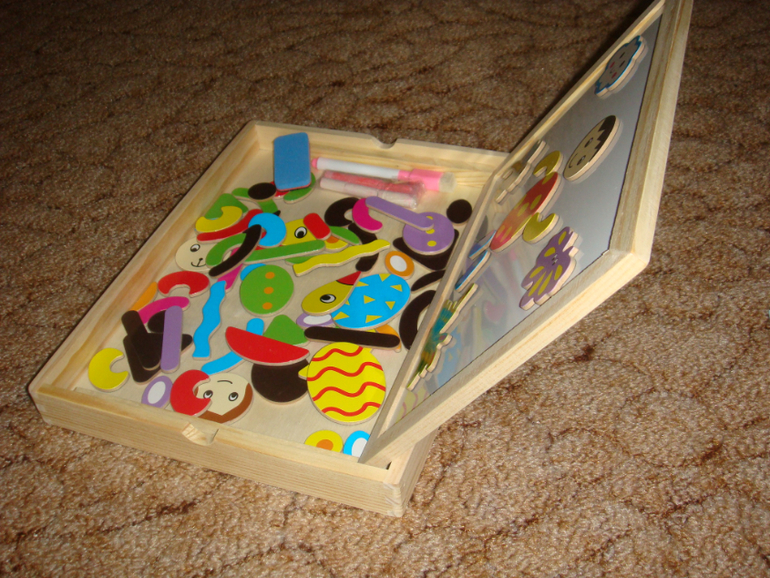 Развивающие игрушки (пазлы, вкладыши, конструкторы, мозаики)Пришла к нам наконец эта игрушка. Очень даже хорошая. Лизе нравится. На одной стороне составляем различные картинки, на другой можно рисовать. Вообщем за такую цену очень даже рекомендую. Детальки деревянные, закругленные. Магнит по всей поверхности. Мелки и спонжик в комплекте. Есть образцы картинок, которые можно собрать. Но мы пока просто человечков, зайчиков делаем, солнышко и тучки.