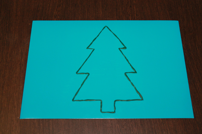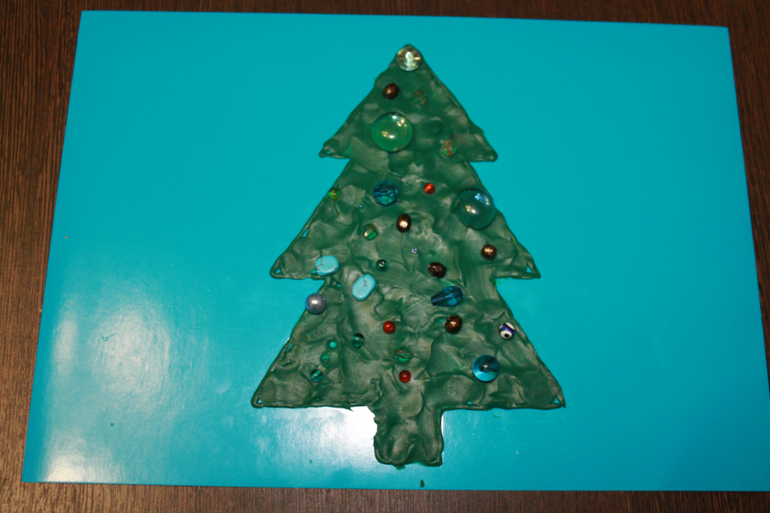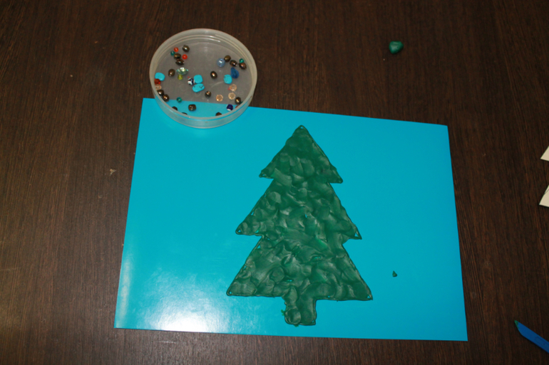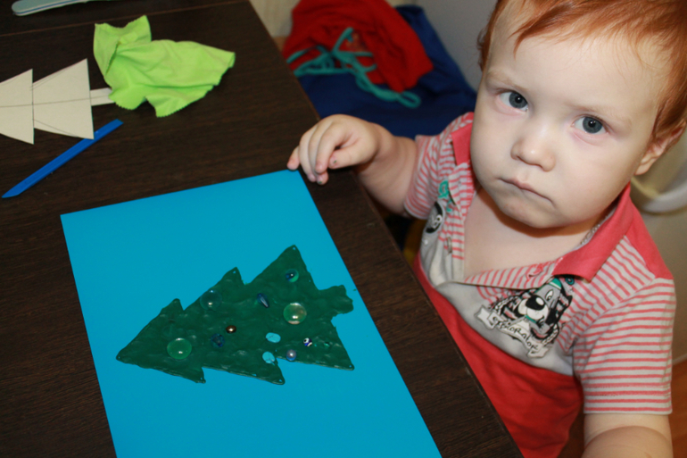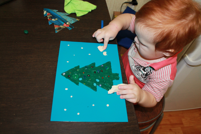 Наше творчество было совместным. Он прилиплял довольно большие куски пластилина, а его оказывается мало, когда применяешь по назначению) поэтому я их размазывала, и залепляла дыры в елке.