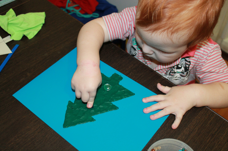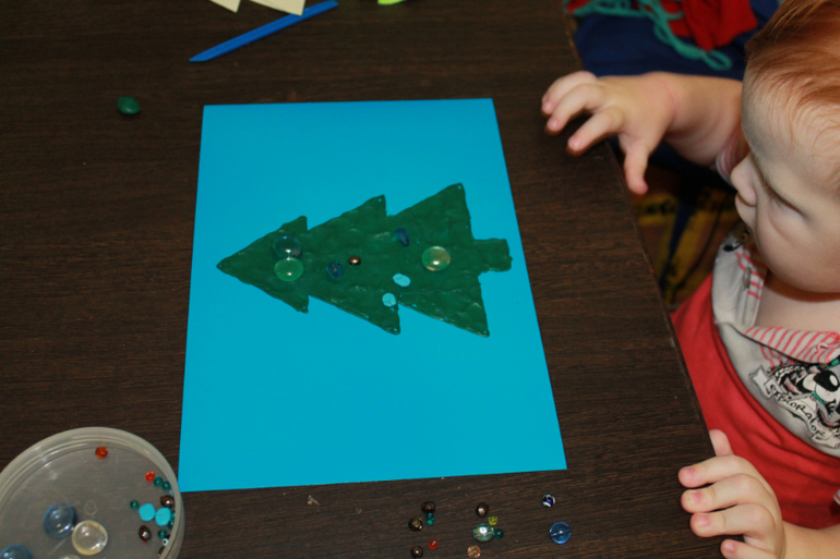 Потом Тимур убежал.Но не долго бегал, приступили к украшению елки. Я взяла бусинки, они оказались слишком мелкими и не сильно видны на фоне елки. Следующую сделаем с пуговками)
