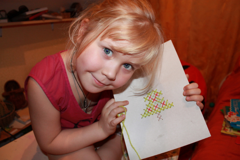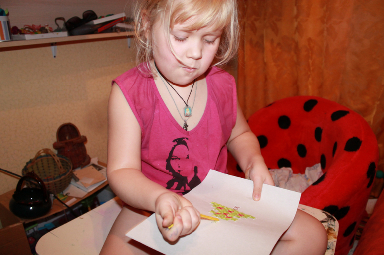 уже с бубнчиками,тут видно что сначала прорисовала карандашом,а потом крестики наметила фломастерами,чтобы дочке было ясно где каким цветом делать