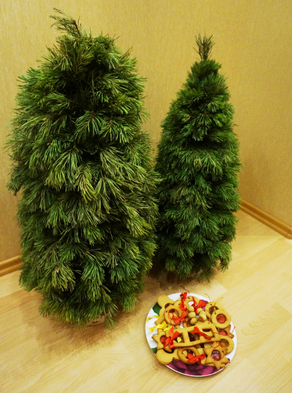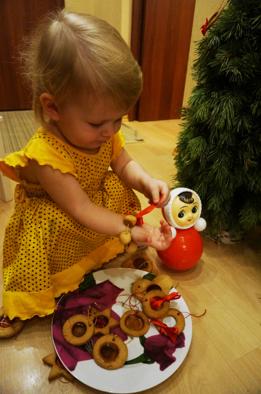 Игры и игрушки от 0 до 99 (Про игры и игрушки которые подойдут и большим и маленьким)Папа нам с Машей принес 2 чудные сосенки. Игрушек в гараже мы не нашли, пришлось ваять свои! Месили, лепили, пекли рождественское, медовое, пряное, ВИТРАЖНОЕ печенье! Рецепт может подойти любой для имбирных человечков, а чтобы сделать витраж нужно мелко порубить конфеты-леденцы, заполнить серединки,запечь, а потом остудить. Дырочки для ленточек мы делали коктейльной соломкой. И вот наши елочки нарядные!!!Ура!