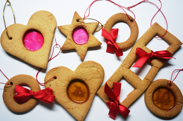 Растопить 200гр меда и 130 гр сахара (лучше коричневого), остудить. Смешать 100 гр сливочного масла (мягкого), 1 яйцо, смесь меда и сахара, 500гр муки, соду гашеную уксусом или пекарный порошок, а такжу любые пряности по вкусу - корица, кадамон, ванильный сахар, гвоздика итд....замесить тесто, поставить в холодильник остужаться. Приготовить колотую крошку из цветных леденцов. Достать тесто, раскатать примерно 0,5см вырезать формами, положить на пергамент и противень, засыпать порошок, поставить в духовку на 170С до золотистого цвета.