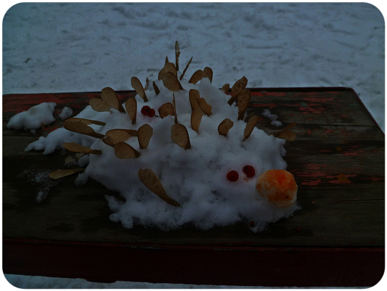 Хотели покормить птичек, но пока ходили за хлебом они ВСЕ улетели, поэтому пошли лепить снежный пирог. И пока мама прыгала по скамейкам пытаясь нарвать с верхушки дерева побольше рябины, дочурка уже качала ежика на качельках и позвала меня есть этот торт )))