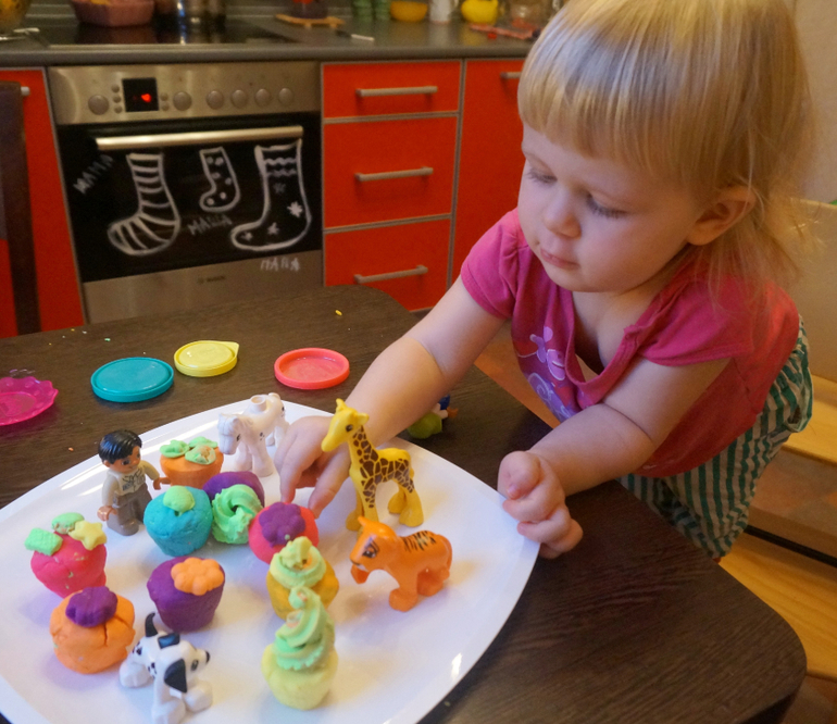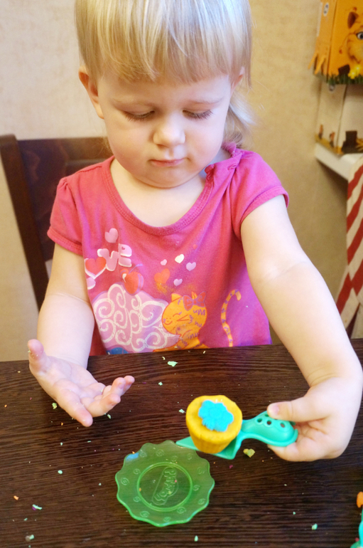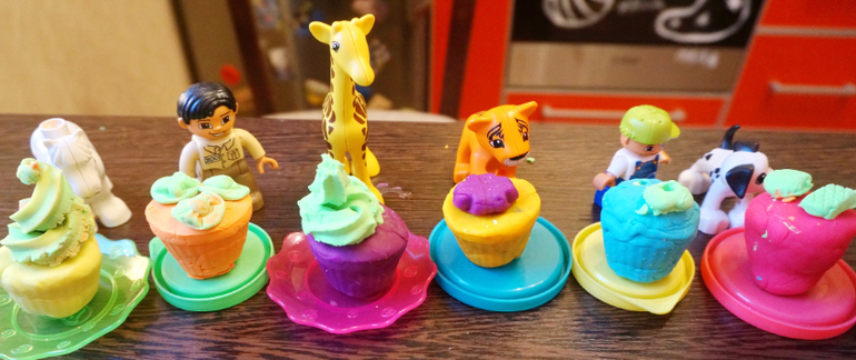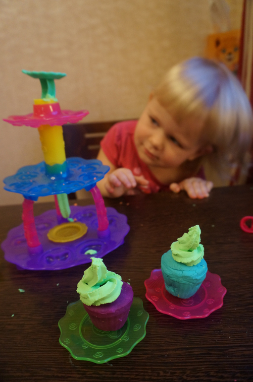 Мистер Умелец или Очумелые ручки (поделки, аппликации, интересные находки, идеи и задумки)Как только мы устроили с Машей замес на кухне, изготавливая витражное печенье, так, тут же наш папа купил нам мини набор Play Doh для приготовления капкейков. Красивая корзиночка, формочки, шприц, 2 тюбика пластилина с пометкой "плюс", то есть имеющего более мягкую текстуру, которая позволяет более красиво и легко выдавливать крем. Минус на мой взгляд в неудобности доставать мелкие украшения из формочек, родителю трудно, а ребенку и подавно. Но в целом, красиво, вкусно, увлекательно!