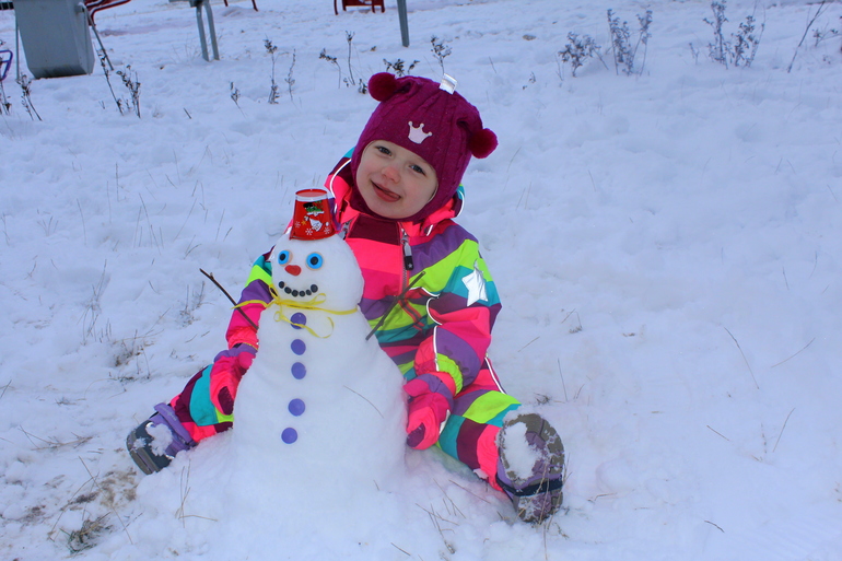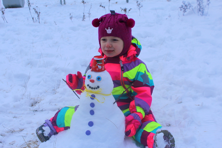 На следующий день мы уже вооружились заготовками глаз, пуговиц, носа из пластилина. И снеговик получился просто чудесный!!!