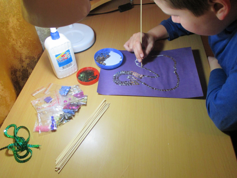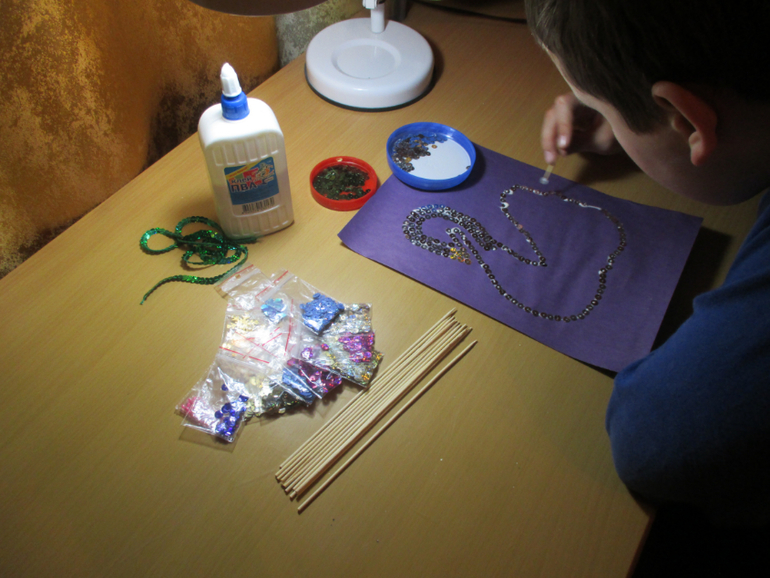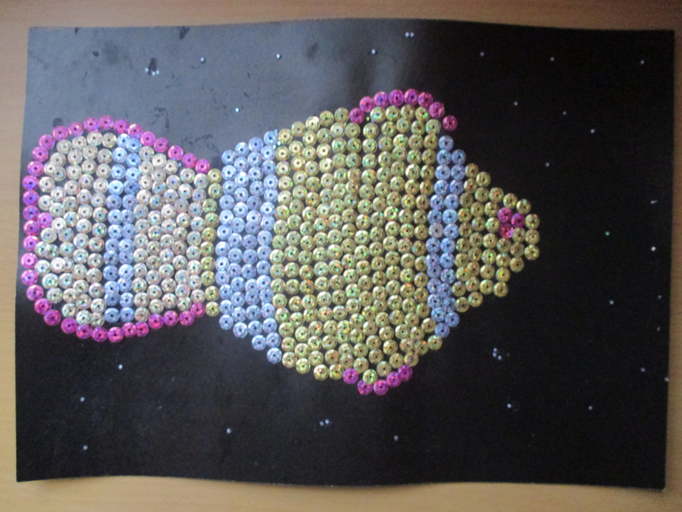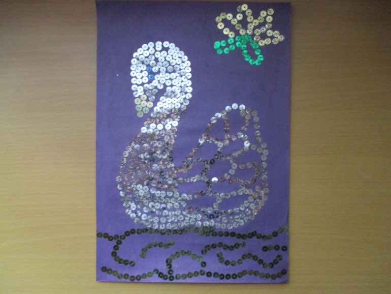 Мистер Умелец или Очумелые ручки (поделки, аппликации, интересные находки, идеи и задумки)Наше увлечение паетками началось с того, что мы решили сделать на День рожденье дедушке картину с рыбкой. В конце работы старший сказал, что это получилась золотая рыбка и она выполняет любые желания и малышка наотрез отказалась её дарить. Пришлось дедуле сделать другую поделку лебедя и ещё рамочку для фотографий с внучатами. Процесс так увлёк, что мы не остановились и сделали новогодние поделки, к тому же они очень эффектно смотрятся при свете (переливаются, блестят). Вот что у нас получилось.