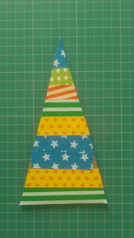Основа ёлочки из картона, далее я нарезала цветную бумагу с узорами бумагу на полосы толщиной примерно 1,5 см, а дочка наклеила. Потом излишки краев я отрезала ножницами. Клеила дочка сама, в том числе выбирала какие полосы и в каком порядке клеить. Бумагу использовали вот такую![]()