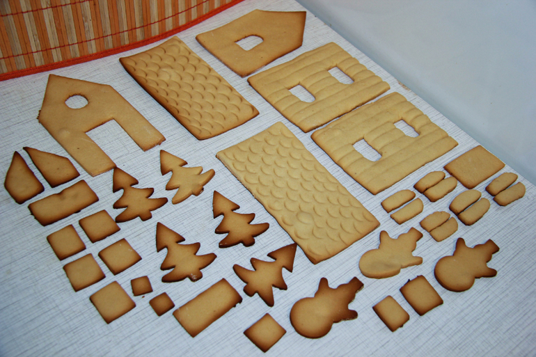 А затем, собственно, испекли части домика в течение 10-12 минут при температуре 220-230 градусов. Разложили полученные детали на ровной поверхности и дали им остыть и чуток «отлежаться».