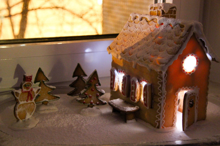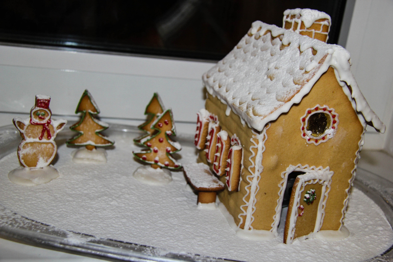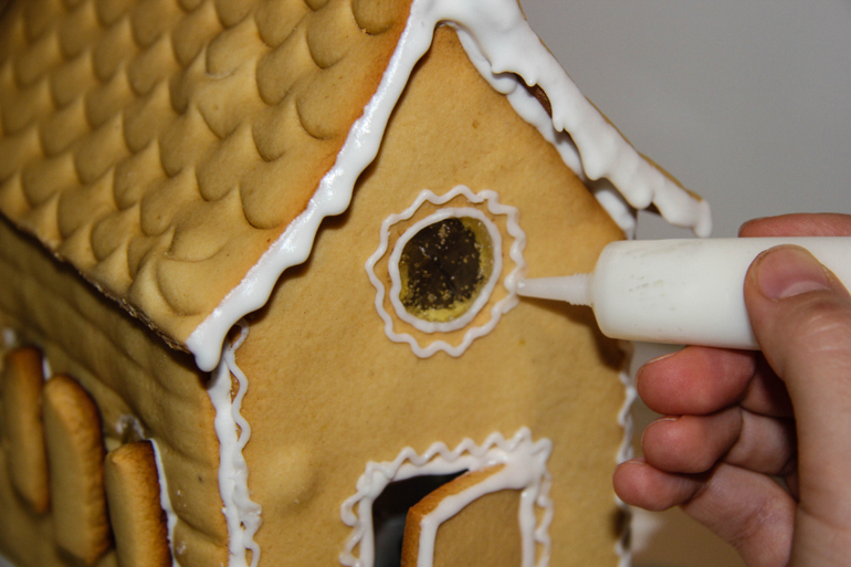 А когда наш домик окончательно "склеился", мы осторожно перенесли его на поднос, подложив внутрь дома маленький включенный фонарик для подсветки, и я оторвалась окончательно декорировала его глазурью.
